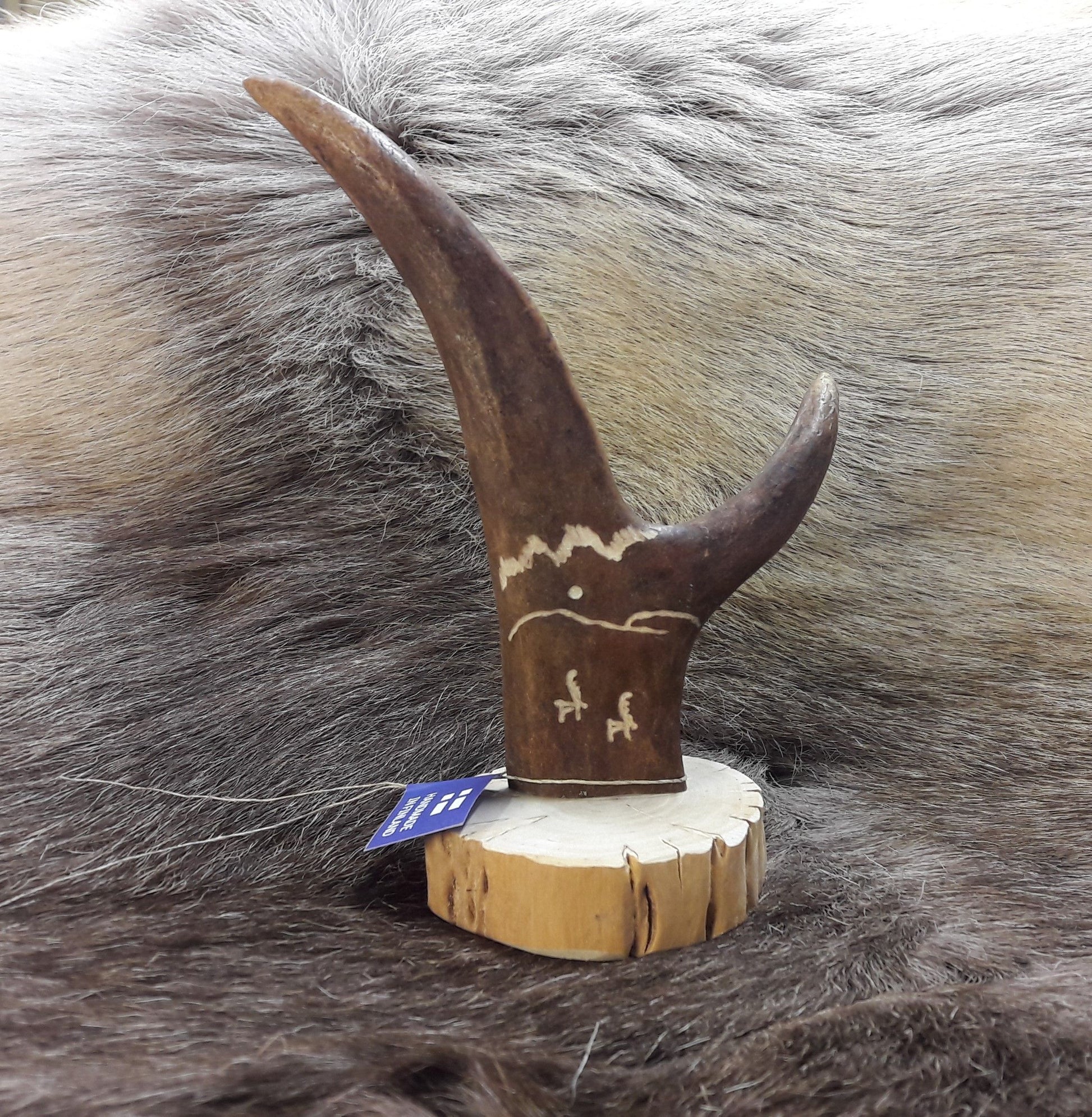 Sarvinen patsas lappiaiheisella kaiverruksella visakoivualustalla