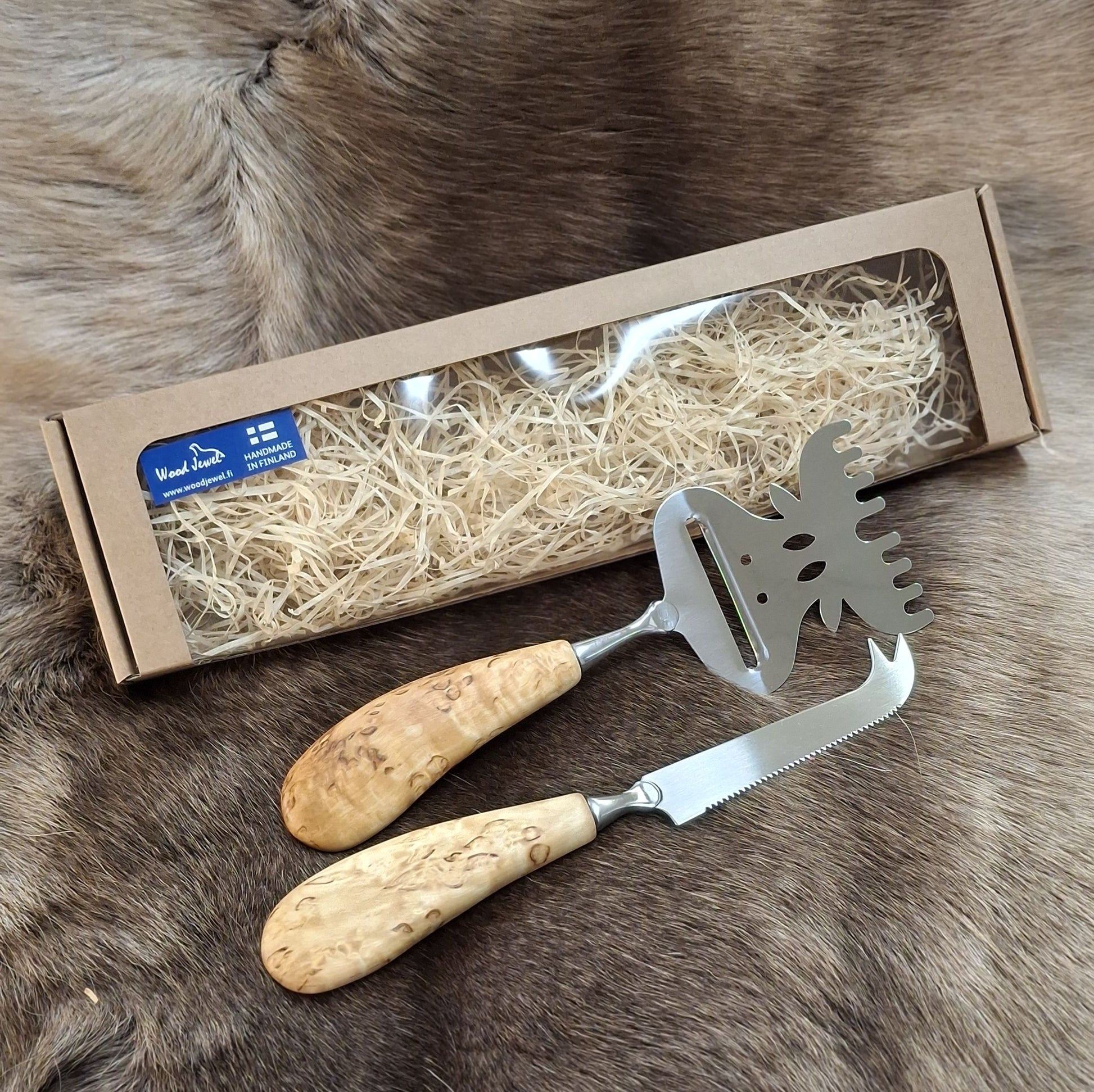 Juusto-ottimet (juustohöylä ja -veitsi); visakoivukahva; hirvenpää terällä; lahjarasiassa